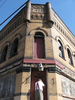 We'll be removing a feral colony from a derelict building on the corner of 8th and Talbot in Braddock starting at 10AM this Friday the 17th. The colony looks pretty healthy, and since the structure is slated for demolition, it's time for them to move! We plan to cut the brood comb to fit deep hive body frames, secure them in empty frames with gum bands, and divide them up into "nucs" so we can requeen them with queens from Hawaii (due to arrive by post today!). All these new minicolonies will go out to the SteffesWood apiary in Aliquippa, so Robert can closely supervise queen acceptance and build them up. As the new queens start laying, we'll use the new colonies for Burgh Bee apiaries in town, as well as have a few (hopefully) for individuals taking the course.